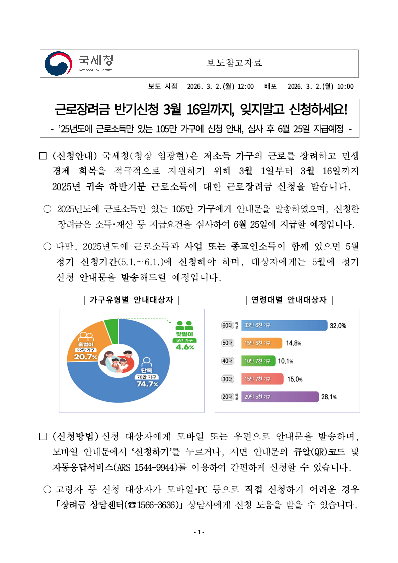 특히 2025년 하반기분 근로장려금은 3월 1일부터 16일까지만 신청을 받고 있어서 지금 이 글을 보시는 순간 바로 확인하셔야 합니다.